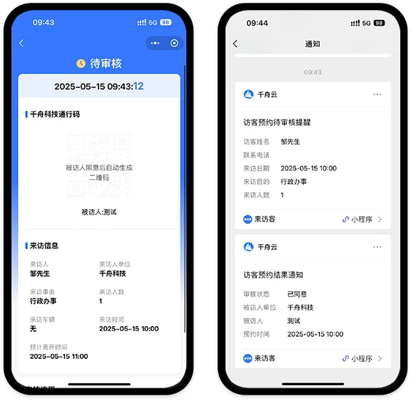 审批流程配置:被访人审核通过后自动生成通行二维码。 实时消息提醒:访客提交申请后,被访人会收到服务号通知;审核结果(同意/拒绝)也会即时推送至访客端。