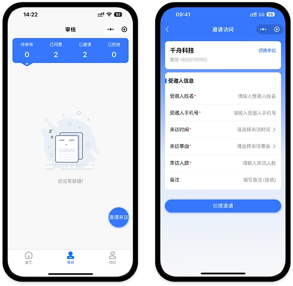 被访人填写信息:填写受邀人姓名,手机号,来访时间,事由,人数。