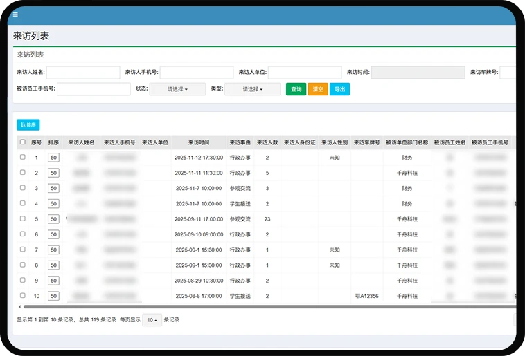 预约记录查询:被访人可查看所有预约记录,包括访客姓名、手机号、访问时间及状态(已审核/待审核/已取消); 数据导出:支持管理员将预约数据导出为Excel表格,按日期、时段、人员等维度分类,便于后续分析或存档。