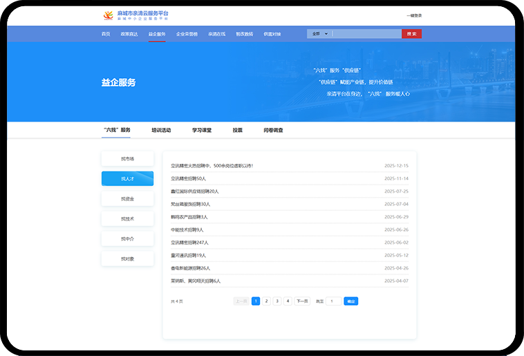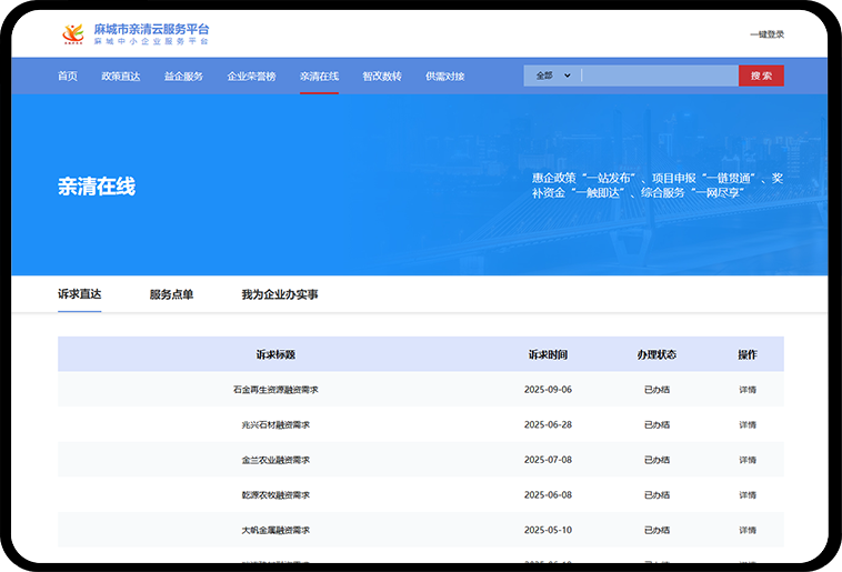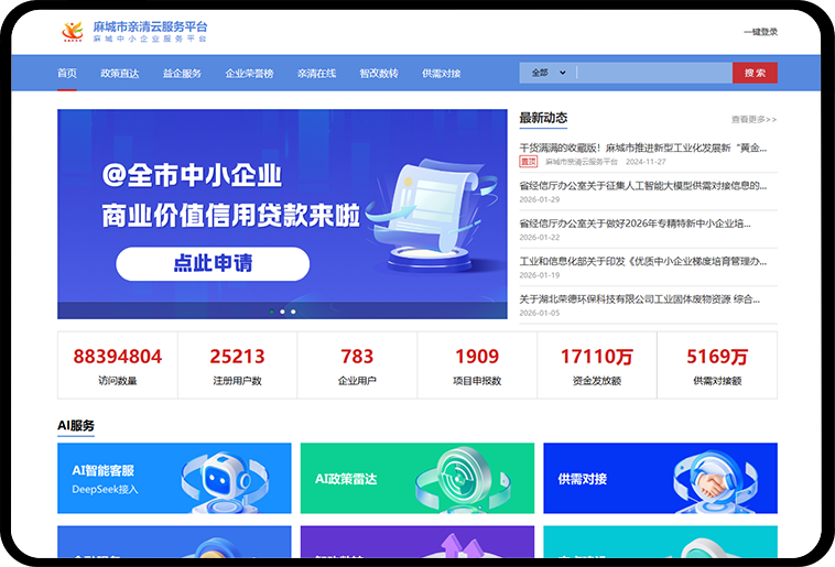 首页作为亲清云服务平台的综合展示窗口,集中呈现平台核心功能入口、重点政策信息、最新通知公告和服务动态。通过可视化布局和模块化设计,引导企业快速了解平台能做什么、能办哪些事,实现“一屏总览、一点直达”,帮助企业高效开启平台服务。