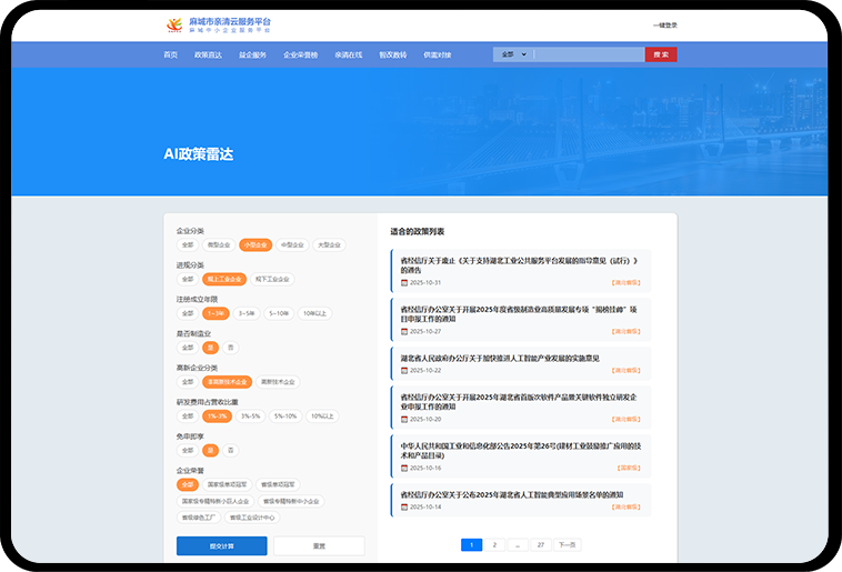 AI政策雷达通过智能分析企业行业属性、经营规模和发展阶段,自动匹配可享受的政策资源,实现政策的精准推荐与主动推送。帮助企业第一时间掌握政策动态,避免“政策看不懂、申报不及时”的问题,让惠企政策真正精准落地。