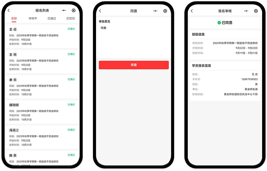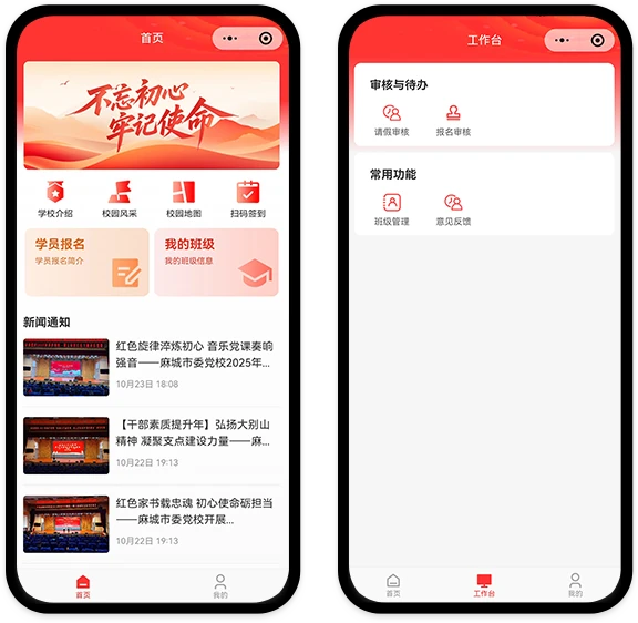 高效处理学员的请假审批等各类申请。该功能实现了线上提交、审核与批复的全流程数字化管理,显著提升了管理效率,确保了党务和教学管理工作的规范性与便捷性。