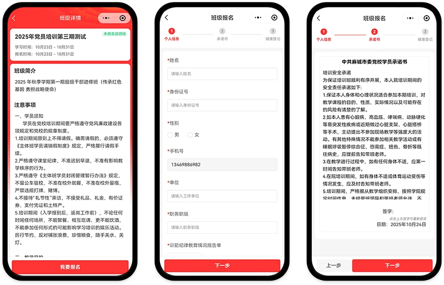查看所有班级信息→点击报名→填写基本信息→签署承诺书(手写签字)→填写健康情况→等待管理员审核