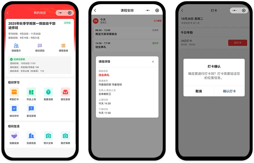 以班级管理为核心,依托课程安排科学规划教学进程。学员通过考勤打卡完成日常考勤,配合班级签到实现特定教学场景的精准统计。