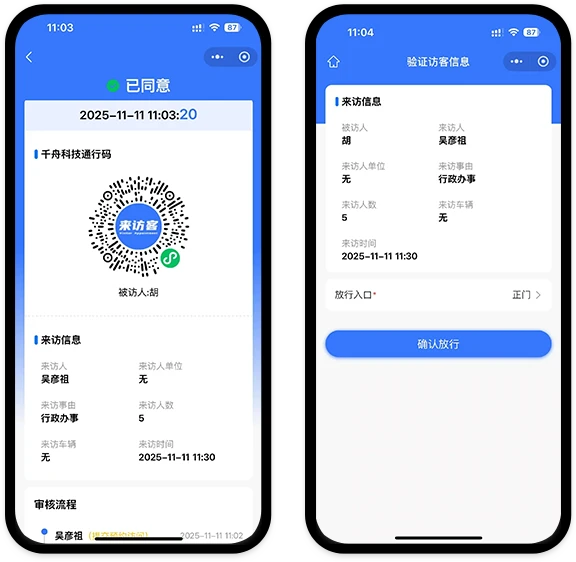 扫码通行:访客到达现场后,出示小程序内的通行二维码,保安或门卫扫码核销即可放行,减少人工登记时间。