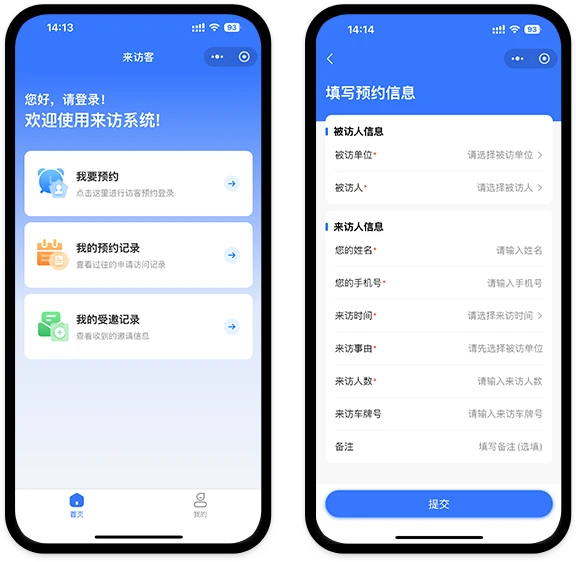 自助填写信息:访客通过微信搜索“来访客”进入小程序,填写被访人、被访单位、姓名、手机号,来访事由(如商务洽谈、维修、参观等)等必填信息。支持选择具体日期、来访时间、离开时间。