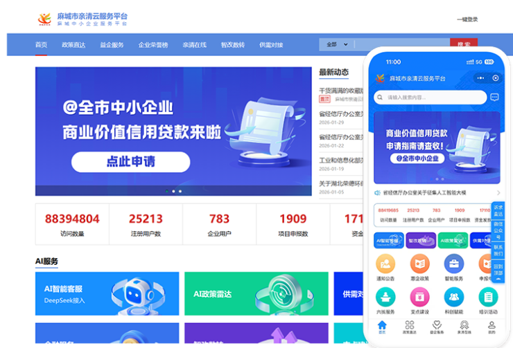 首页作为亲清云服务平台的综合展示窗口,集中呈现平台核心功能入口、重点政策信息、最新通知公告和服务动态。通过可视化布局和模块化设计,引导企业快速了解平台能做什么、能办哪些事,实现“一屏总览、一点直达”,帮助企业高效开启平台服务。