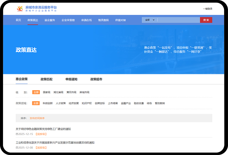 政策直达模块聚焦惠企政策的精准推送与高效触达,整合国家、省、市及本地各类政策资源,按照政策类型、适用行业和支持方向进行分类展示。企业可快速查询适合自身发展的政策信息,减少政策查找成本,真正实现政策信息“看得懂、找得到、用得上”。
