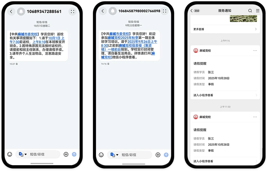 管理后台可灵活配置短信模板并设置向学员公众号推送消息,实现关键信息的多渠道、自动化精准触达,确保通知及时送达。